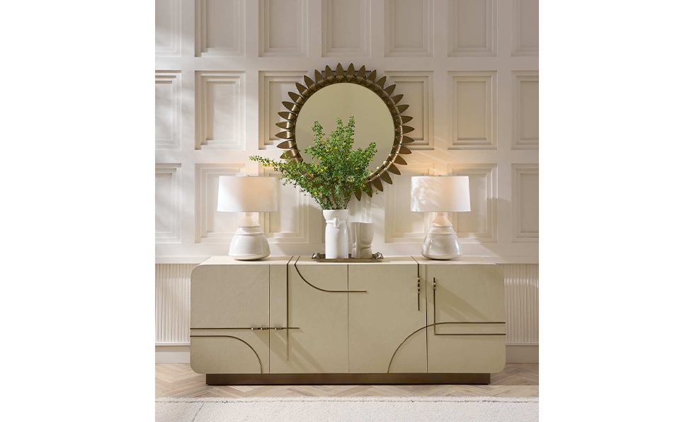 Wrapped in topstitched ivory leather and set on a satin walnut oak veneer base, the Art Deco-inspired Montevito credenza from Arteriors features soft-close doors with semi-circle pulls and 12 adjustable shelves.