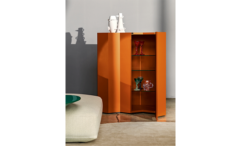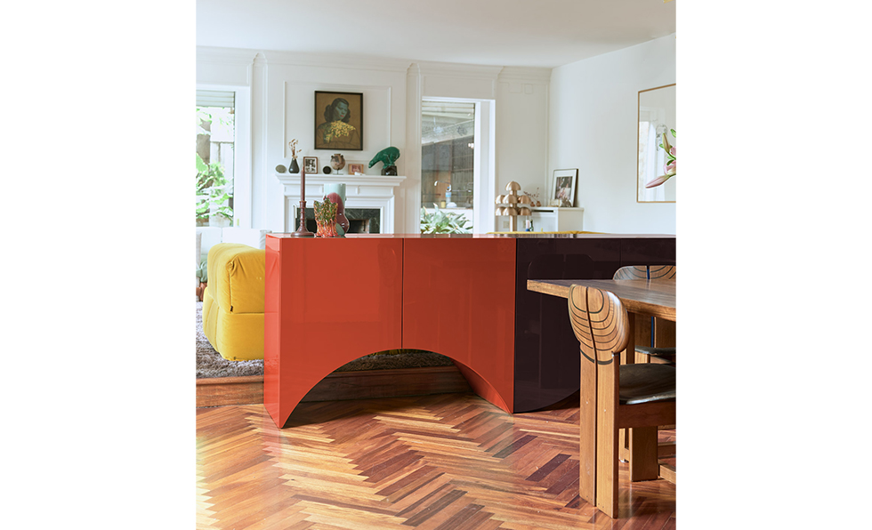 Designed by Muller Van Severen, BD Barcelona’s Bridges cabinet collection transforms the silhouettes of the duo’s Wave vase series into sophisticated storage with sculptural cutout bases and glossy finishes of bright colors that highlight its architectural forms.