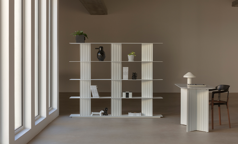 Designed by Antoni Pallejà Office, Plec Shelving for RS Barcelona turns storage into sculpture with its folded steel frames and aluminum shelves. The easily adaptable modular system is available in 21 colors, three heights, and four lengths.