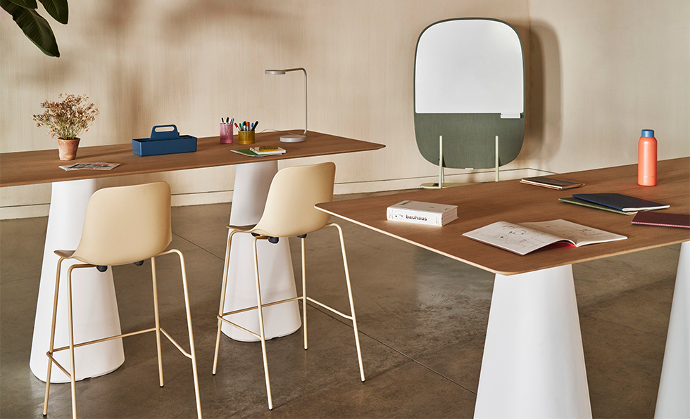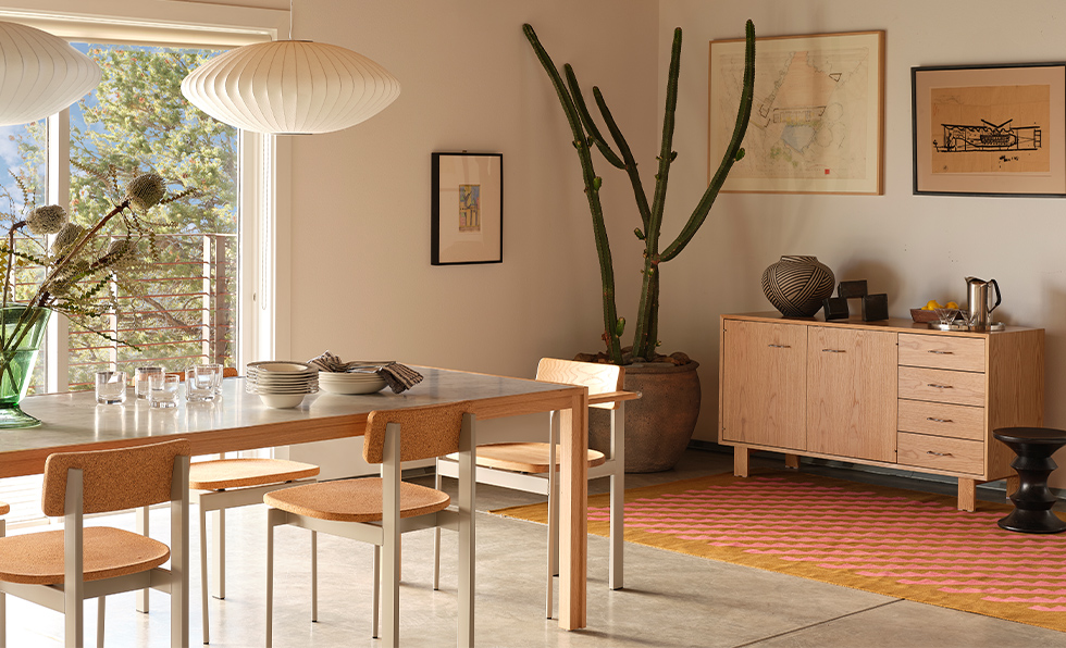Topped in wood or stone, the Michael Anastassiades-crafted Doubleframe table for Herman Miller elevates the Parsons silhouette with a rectilinear form and corner placed legs that branch into a double frame.