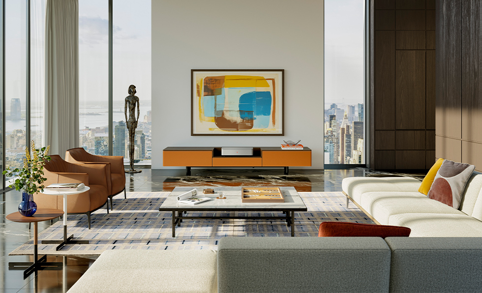 Part of a collaborative design effort between Roberto Lazzeroni and Leica, Poltrona Frau updated the Fidelio multimedia cabinet with a dedicated drawer for the Cine 1 smart laser TV and a motorized projection screen.