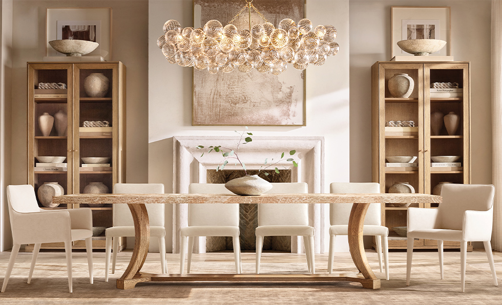 Finding inspiration from timeless mid-19th-century French design, the handcrafted Genevieve Emperador dining table from RH combines honed marble with wire-brushed European white oak for a stylish result.