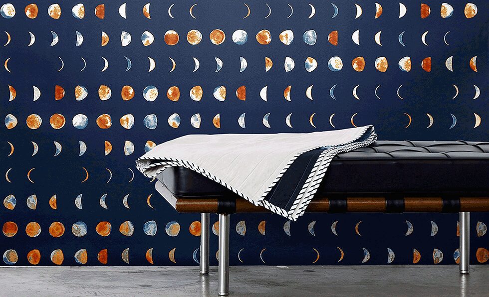 Handpainted using watercolor and gouache, and then digitally printed on a silvery mylar, the Utopia collection’s Selene pattern from Astek depicts an invented lunar calendar.