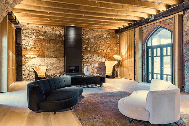 The old mill itself is the biggest source of design inspiration, leading to the incorporation of salvaged granite paving and wrought-iron columns, along with vintage machinery; reclaimed wood, iron, and brick; and natural materials like oak and copper that nod to the site’s past. “The raw atmosphere of the Old Mill’s public spaces gradually transitions into a private and soft environment in the guestrooms,” adds Willemeit. “A concrete structure is left exposed as a reminder of the building’s industrial heritage, but layered with a wall painting that alludes to the history, inviting visitors to engage with the location.”