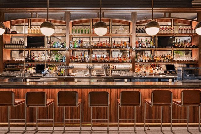 Housed within the former R.J. Reynolds Building, the Katharine brasserie (named for Reynolds’ wife) breathes new life into the former tobacco company’s headquarters recently transformed into Kimpton’s Cardinal Hotel. Brooklyn, New York-based Crème looked to “design a restaurant that acts as the hotel’s soul,” says founder Jun Aizaki, who drew inspiration from traditional French cafés mixed with southern flair to match its Winston-Salem location. Natural elements blend with an Art Deco style highlighted through tobacco motifs and mosaic tiles, while the neutral color palette is illuminated by a variety of lighting, including the pendants hanging above the bar that resemble croissants, says Aizaki.
