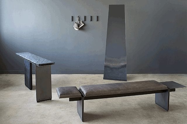 Coming from an intensive branding exercise, the studio has introduced its first product collection inspired by the “relationship between the hand and the machine,” says Berman. It started with a custom patina blackened steel bench manufactured by Desiron with a leather cushion that has since evolved into a corridor collection that includes a console, a mirror, hooks, and a bar cart, all of which demonstrate a balance between “something that is incredibly tactile and has a warmth to it that you want to touch against the thing that is just sharp and crisp and perfect,” he adds.