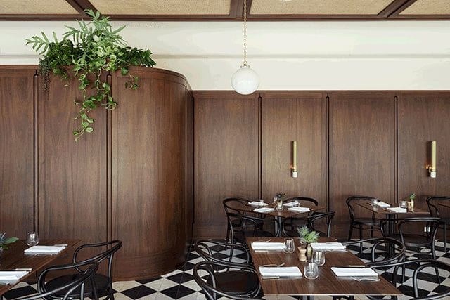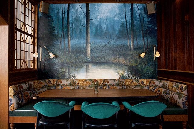 Nestled on a prime corner in the heart of New York’s West Village, the Spaniard is a contemporary and eclectic take on the Irish pub, combining “European tradition with these classic American bars and steakhouses that have been around for 150 years in some cases,” says Home Studios principal Oliver Haslegrave. The casual, inviting environment ramps up the nostalgia with experimental elements like Art Deco-inspired black marble detailing, an old payphone left in the corner, and the firm’s take on the “snug.” Traditionally a small, private or semiprivate room within a pub for those who don’t wish to be seen (frosted glass above seated head height typically looked out on the bar), the Spaniard’s version is defined by a floral upholstered booth and jade velvet chairs that sit below a mural of a misty forest scene.