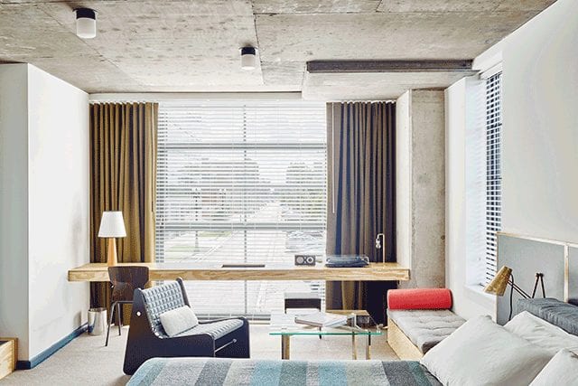 Having worked with Ace on a handful of properties, Commune founder Roman Alonso wanted to “tap into Chicago’s modernist past” for the brand’s latest hotel, with architecture referencing the work of Mies van der Rohe. Alonso chose materials like linoleum on bars and countertops and chrome tubing for furniture that highlight the industrial theme, including stained or lacquered plywood instead of traditional wooden panels. Local artwork from Chicago’s Volume Gallery pepper spaces throughout the hotel, while drawings and paintings from students at the Art Institute of Chicago adorn the 159 guestrooms, which boast striped bed throws, built-in benches, contemporary seating, and metal racks for hanging everything from clothes to guitars.