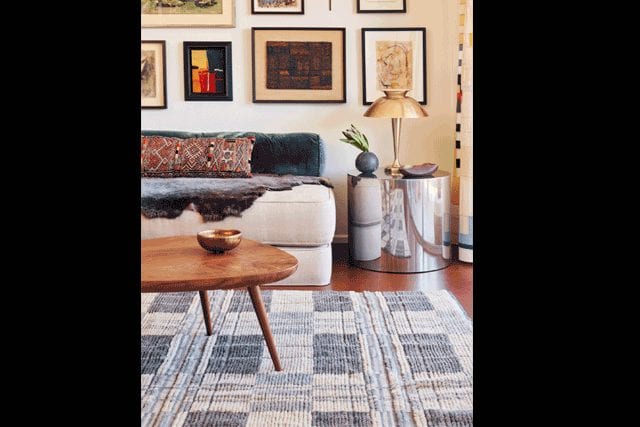 “Our product lines are an opportunity to look inward at who we are and the things we love as designers,” explains Alonso, who has had a longstanding relationship with British company Christopher Farr. Three years ago, Commune created a small line of fabrics for Farr’s Cloth collection, so the rugs followed “very organically,” notes Alonso. Their collaboration, available at Crosby Street Studios in New York, features 10 versatile pieces that blend handspun wool, silk, and jute to create a variety of styles, including flat weave, shag, hand-knotted, and tufted options.