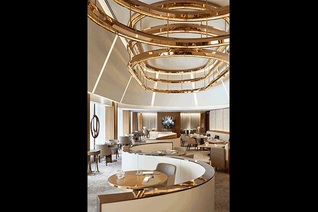 “The new design has a lightness that mirrors the evolved style of cooking, and the natural materials and organic lines speak to the careful consideration and treatment of each ingredient,” he adds. Now, bronze ring-shaped chandeliers complement wood and bronze tables, and the curvy, low partitions that meander through the dining room create as much visual depth as privacy. Details such as the wall upholstery’s embroidered circular patterns and the ripple motif carpet bring a softness to the space.