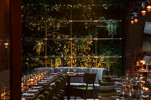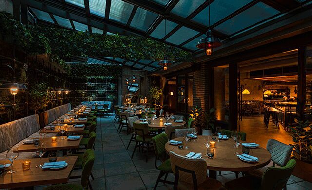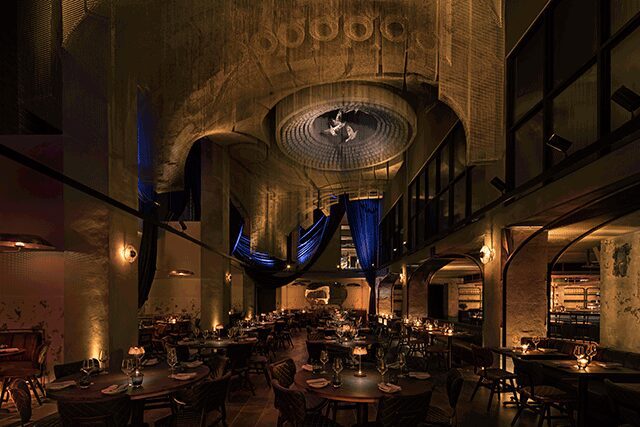 The South of France was the inspiration behind Cathédrale, TAO Group’s latest inside the Moxy East Village in New York. Teaming up with longtime collaborator Rockwell Group, which also designed the hotel (Stonehill Taylor handled the architecture), the 300-seat, French-Mediterranean restaurant helmed by executive chef Jason Hall indulges the New York firm’s signature theatrical style. The lofty space comes to life with a series of elevated rooms that incorporate layers of industrial and luxe materials like plaster, copper, plush upholstery, navy drapery, and vintage rock posters that “reflect the East Village’s vibrant music scene,” says Rockwell Group partner Greg Keffer, directly referencing the legendary concert hall Fillmore East across the street. The main dining room is “intimate, but there’s also a sense of grandeur to it,” says Keffer, while the patio is just as inviting with layers of greenery and a retractable roof. The dining room’s centerpiece, however, is Italian artist Edoardo Tresoldi’s showstopping ceiling installation: an ethereal mesh-wire sculpture, where rose gold birds in flight are encased by a fragmented central dome and deep chasms, harmonizing delicate details with monumental scale.