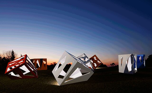 Located in a secluded, peaceful outdoor space in the town of Bisei, Okayama Prefecture in Japan is a whimsical constellation of boldly colored geometric structures—a fresh take on tea ceremony houses inspired by the galactic universe beyond. “The site is surrounded by rolling hills and distant mountains and offers views of a spectacular landscape,” says Moriyuki Ochiai, architect, designer, and founder of Tokyo-based Moriyuki Ochiai Architects, adding that the project also honors Eisai, a Japanese Buddhist priest born in the Okayama Prefecture who is credited with introducing green tea to Japan.
