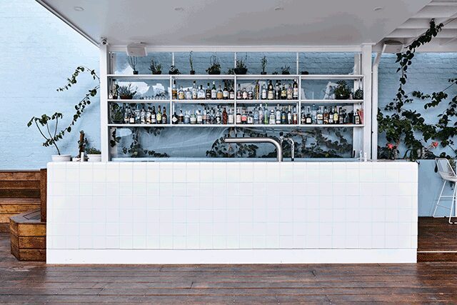 Plants and circular pendants cascading from the ceiling punctuate the lower level of Peaches, the pretty in peach bar from Amy Pierce and Nat Widera, cofounders of local design practice, Pierce Widera. Here, terrazzo tabletops, a green-veined onyx bar-top, moss green stools, and shiny brass details elevate the interior to a luxurious level. The light and airy upstairs is a lesson in contrasts with pastel blue walls and a cocktail bar wrapped in white tile. “The design had to attract patrons walking past on busy Swanston Street,” says Widera, while still being able to lure people downstairs to the chic bar.