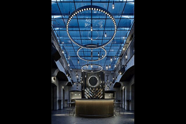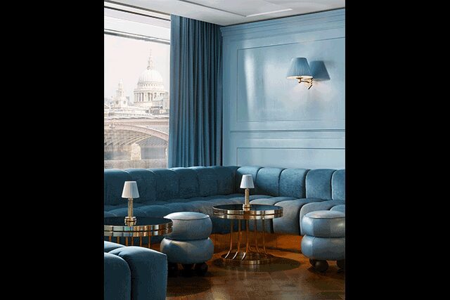 Offering unparalleled views of London and the Thames river, Lyaness—with a menu by master mixologist Ryan Chetiyawardana—is a sumptuous haven within Sea Containers London. Formerly home to the acclaimed Dandelyan, the space has been reimagined by Jacu Strauss of Lore Group as an homage to the theatricality of the 1920s with a few hints of ’70s retro throughout. “We tried to create a cocktail bar that goes beyond the simple focus of what’s in your glass,” says Strauss. “Comfortable and fun with a distinctive retro-glam vibe, it’s a destination where glamour meets Brutalism.” A cerulean leather tufted banquette leads to a stage-like area where an octagonal mirrored light fixture reflects the room. The sweeping green marble bar, meanwhile, was cut from a single block of Verde Guatemala that Strauss picked himself. “It’s the feature of the space,” he says, “highlighting the theater of cocktail making.”