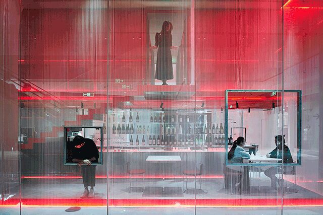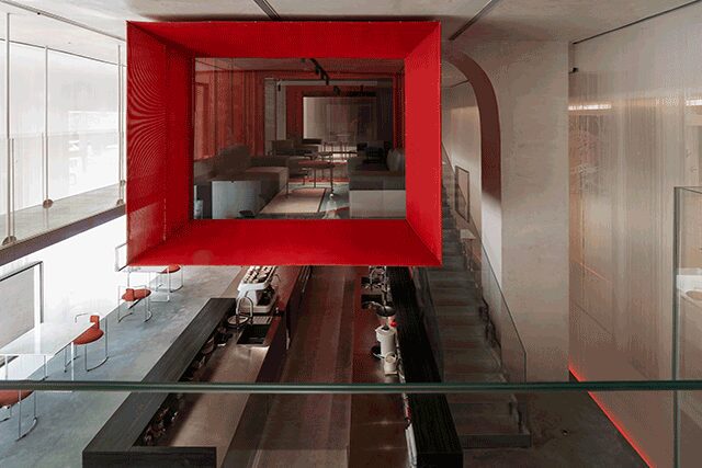 Tapping into and harnessing the power of the digital age, Doko Bar by Taipei, Taiwan-based Waterfrom Design is geared toward the social media-savvy customer, taking inspiration from Pop Art icon Andy Warhol, who famously said, “In the future, everybody will be world famous for 15 minutes.” The “360-degree immersive theater deconstructs traditional dining rituals to record the reality that is happening now,” says design director Nic Lee. Open, translucent spaces within the dessert bar are defined by the brand’s coral red color, in addition to mesh, galvanized and stainless steel plates, acrylic, old elm wood, cement flooring, and layers of nylon rope. The centerpiece is a floating red box of perforated netting that frames the VIP room on the second level. The design nods to “the intricacies of the human network in this modern society,” says Lee, showcasing how our lives have become “both transparent and concealed.”