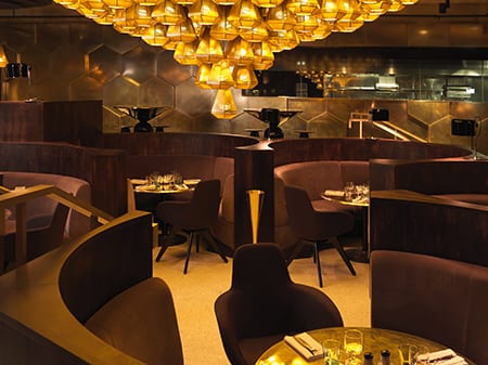 At the back of the dining room, a series of semi-private tables encased in dark wood resemble honeycomb cells. The repeat pattern has an underlying meaning and multiple applications. “The service area is clad in geometric brass panels in a honeycomb motif,” Dixon explains. “‘L’Hexagone'” is slang for France, due to its shape.”
