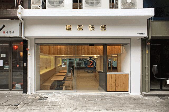 Unlike its neighboring restaurants, Hong Kong’s Slow Cook Fast Food from local firm Plot Architecture “is stripped down to a minimal portal that maximizes the exposure of its interior,” says the firm’s director Gordon Ngan. “The highly transparent shop front directs the attention of passersby toward the contrasting volume inside.” The neutral environment boasts a T-shaped divider that demarcates the entrance and the ordering counter, while timber planks clad the double-height void beneath the ceiling in a U shape. A graphic-tiled grid creates a visual backdrop on the end wall to tie all the elements together. “We focused on identifying and highlighting the existing special qualities of the space, and used neutral forms and material to enhance the dining experience,” adds Ngan.