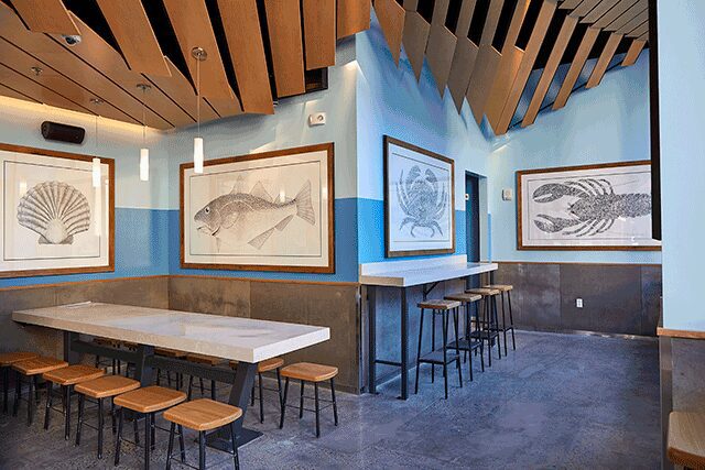 In finding the right aesthetic for Eventide’s second outpost, which took the popular Portland, Maine oyster bar to the busy Boylston Street in Boston’s Fenway neighborhood, Portland’s Kaplan Thompson Architects and Embarc Studio from Boston collaborated on a concept that “creates a crisp, clean, and metropolitan space that fits into Fenway’s urban setting,” says GM and owner Arlin Smith. To do so, the designers chose a calming blue palette to complement natural materials, including zinc, wood, concrete, and glass as well as two large communal tables that sit in front of the floor-to-ceiling windows. The real standout, however, is the Rock, a sculptural yet functional collection of huge granite boulders that displays the restaurant’s selection of oysters—the real star of the show.