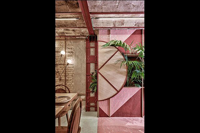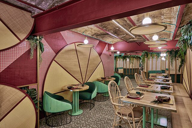 The entrance mixes mosaic tiling in pink and burgundy with an abundance of tropical plants that spill from the walls. Decorative rattan circles are reminiscent of the hats worn while working in rice fields. At the bar, colorful mosaic tiling in geometric patterns is mixed with a traditional Japanese wooden pattern and playful parrot lamps designed by the local firm (as are all of the lights, barstools, and tables). Upstairs, rounded seat niches blend both cultures. Throughout the space, the building’s existing vaulted ceiling, beams, and bricks (kept as is, with timeworn scratches and all) tie together three cultures into one vibrant space.
