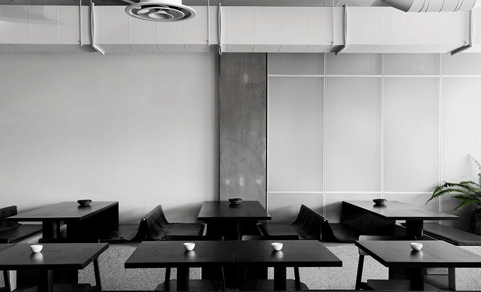 Located in Melbourne with a design by Ritz & Ghougassian, Penta’s concrete bar in its monochromatic palette of white, gray, and black joins exposed ductwork and chrome cabinetry for an industrial edge.