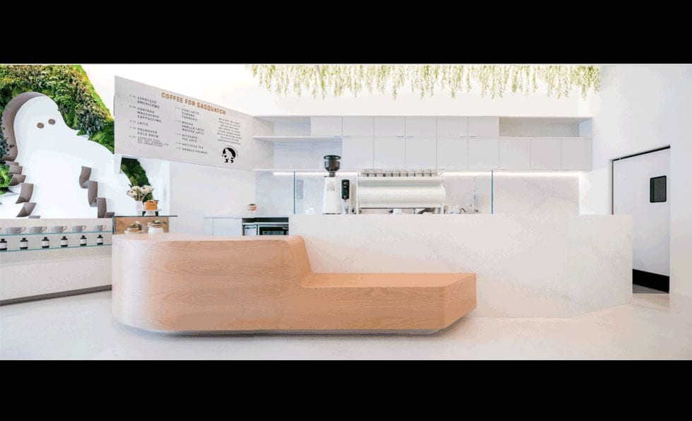 Dan Brunn Architecture‘s design for Coffee for Sasquatch in Los Angeles features a terrazzo-lined café with a stylized Sasquatch figure emerging from a living plant wall.