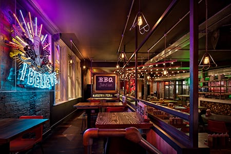 Red’s True Barbecue, the second of its kind in the UK, introduces the American low-and-slow with punch and humor. “We took a lot of inspiration from the client-the guys themselves,” says designer Jordan Littler of London-based Blacksheep. “Americanizing it wouldn’t be authentic, because the guys aren’t American. It’s their version of barbecue.”