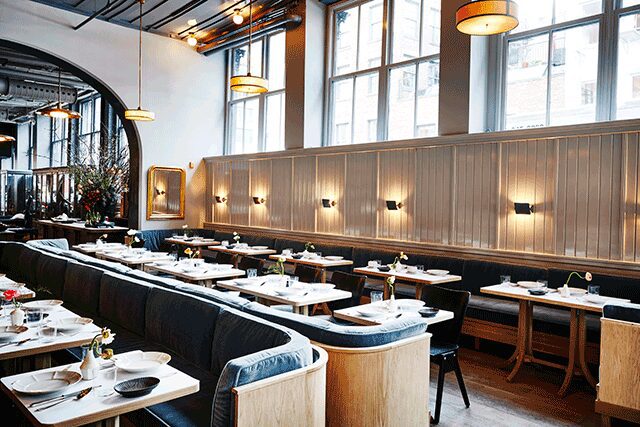 For the design, classic shapes mix with warm woods in an open layout that channels a bohemian, residential aesthetic. Blue velvet banquettes line the bright and airy café, echoing the color of the storefront façade. In the darker, moodier adjacent room, a mural depicting a forest at night wraps the walls and a black wet bar, while gray cabinets lined with pottery, inviting furniture, and artwork all offer a homey feel for a sumptuous journey.