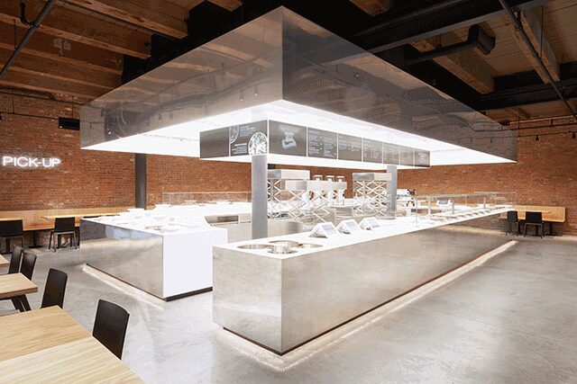 Manhattan’s Meatpacking District is the inaugural location for Dean & DeLuca’s high-end fast casual concept Stage. Designed by visionary architect Ole Scheeren, Stage is “a highly engineered yet very simple object that acts as a social interactive tool,” Scheeren says of the performative space. “The idea was to create something that is easily repeatable and recognizable, at the same time, would never be the same.” The architect’s initial strategy includes plans for a potential global rollout of the structure that could quite literally be placed in nearly any location around the world, due in part to its minimal design, which is made up of three distinct elements: mirrored stainless steel on the façade, an uninterrupted swath of kitchen-grade Corian as the topography, and 34,000 diodes of undiffused LED lights that act as a single, soft beam of shadowless energy between the two flats. The overall illumination (including down lighting that highlights the food along the perimeter) allows everyone and everything underneath to be put on display in a way that is welcoming rather than overwhelming, proving that “fast food can be a fun, beautiful, and positive experience,” Scheeren says. “Food is such a social part of our lives, but fast food is the most unsocial end of the spectrum. Here, we are allowing everyone to participate through the beauty of the design.”