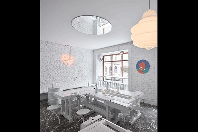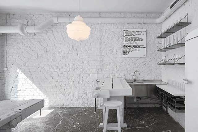 This stark, experimental wine bar from owner Richard Preisler is a coming home of sorts for Prague-based designers Jan Plechac and Henry Wielgus of the local practice, Plechac & Wielgus, who also worked with Preisler on their first project 10 years ago. “In that time, we’ve become friends and we know that having a place like this has been a longtime dream of his,” says Wielgus. The interior of Dvojka expresses Preisler’s personality with a design that’s contemporary yet “a little punk and vintage, with an artistic vibe.” To that end, old workbenches, stools, and functional vintage refrigerators were all painted white, down to the concrete floor. “Everything is white and clean,” says Plechac, except for the wine, Preisler’s artwork from his private collection, and a neon number two on the wall. The dramatic scheme unifies the small space while creating an interesting backdrop for the play of light and shadow.