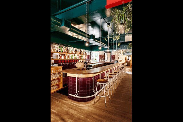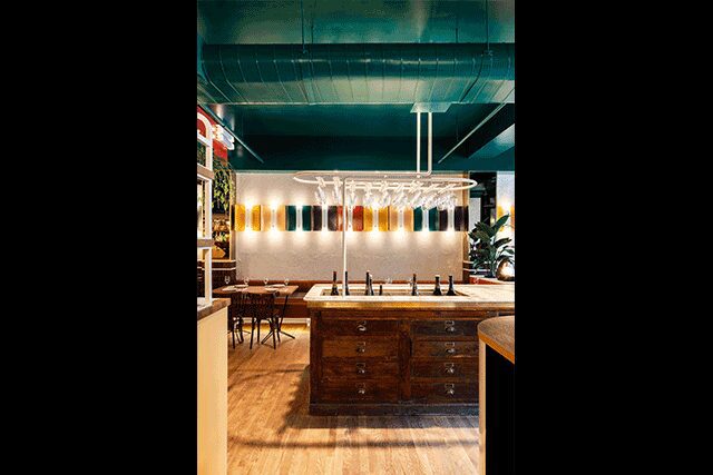 Serving natural wine that is free from pesticides and farmed organically, Montreal’s VinVinVin (meaning wine, wine, wine in French) takes cues from the brand’s graphic bottle labels for a bold design story that includes geometric patterns, a custom mosaic-tiled floor, and rich hues of green, purple, red, and saffron. The 1,650-square-foot space is an “organized chaos of colors” that is balanced by warm white oak flooring, leather banquettes, and beige stucco walls, says David Dworkind of local firm Ménard Dworkind. Further, vintage and custom tables and chairs complement the service island, made from an antique wood dresser that is topped with a travertine slab.