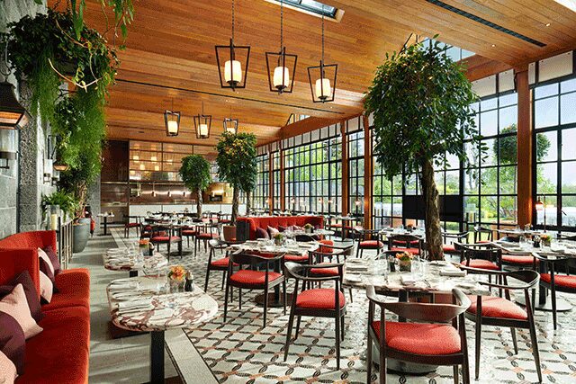 The details: A driving force behind the design narrative for the Carriage House, a swanky golf club that doubles as a dining destination at the enchanting Adare Manor hotel and golf resort set on 840 acres in Limerick, Ireland is “a real tangible sense of history and natural beauty,” says Simon Rawlings, creative director of London firm David Collins Studio. Natural materials marry a rich palette of deep green, burgundy, and ivory, all of which nod to “the surrounding traditional walled gardens,” he adds.