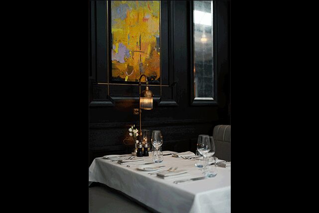 Guests arrive through an arched rotunda in the grand lobby lined with wine displays, antique chandeliers, and several doorways leading to the club’s offerings, including a restaurant, an intimate private dining chamber with a leaf motif wall, a “snug and comfortable” cigar lounge, a hidden cellar bar for private wine tastings, and a terrace overlooking the lush grounds with 200-year-old trees. Just beyond, the sophisticated Tack Room, which was once home to equestrian equipment, now offers a luxurious spin on the traditional pub experience with damson embossed leather dressing walls, custom horsehair furniture, and striking Marmore Verde Lapponia marble for the bar countertop.