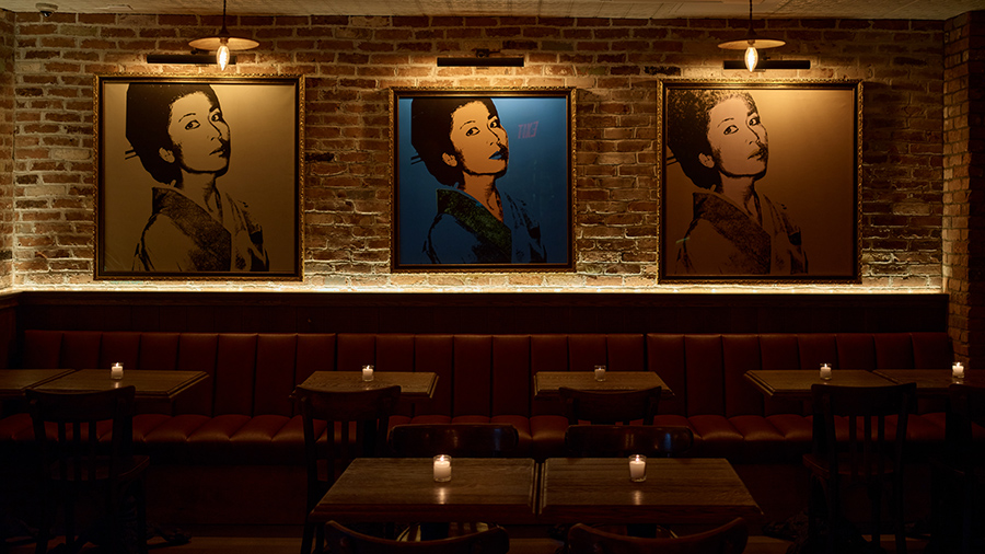 A trio of Andy Warhol’s Kimiko Powers prints hang above banquette seating at Guzzle
