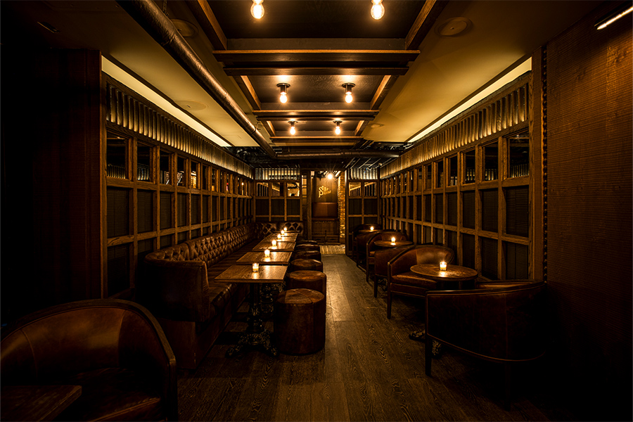 The ground floor Guzzle is reminiscent of a lively New York tavern from the 1860s, the era when a historic Japanese diplomatic mission voyaged to the U.S. Here, old brick and classic millwork melds with distressed white oak floors to create a warm, welcoming atmosphere. Artwork, including black-and-white photographs of landmark buildings and images of rockstars visiting Japan, bridges a connection between the two cities.