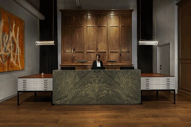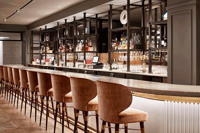St. Jane Hotel > Like the hotel’s namesake, Chicago activist and Nobel Peace Prize recipient Jane Addams, the St. Jane Hotel—a collaboration between local firm Simeone Deary Design Group, Becker Ventures, and Aparium Hotel Group—is a beacon in its community. Housed inside the iconic Carbon and Carbide building with its exterior of deep green monolithic marble and bright, brassy architectural metal accents, the local firm juxtaposed the structure’s masculine architecture with a more feminine feel inside. Those choices, says firm co-owner Lisa Simeone, help support the “Jane attitude and cultural ethos” in a design that had to be concepted and completed in less than a year, in a landmarked building being repositioned from branded to boutique. But there is no evidence of such a rushed timetable. The residential foyer-like entryway is furnished with a vintage-veined fireplace and crowded bookshelves. Blackened moresque walls contrast jewel-toned furniture that sit on an angular bespoke multicolored marble chevron floor. Meanwhile, in the hotel’s 365 guestrooms, black and white herringbone floors and bright white walls create a backdrop to a softer palette of blush, heather gray, and champagne hues.