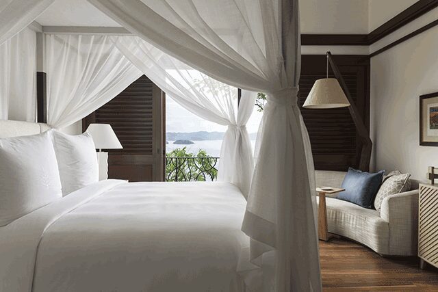 Four Seasons Resort Costa Rica at Peninsula Papagayo > When Meyer Davis set out to refresh the Four Seasons on Peninsula Papagayo in the Guanacaste province of northwest Costa Rica, the New York firm sought to transform the secluded luxury resort into something that is at once “modern and fresh while still highlighting the heritage of the local craftsmanship and community,” says project manager Stephanie Schreiber. The $35 million update culminated in “such a special and unique place that it feels like Costa Rica’s best-kept secret,” says co-owner Will Meyer. Once again Zurcher was called on, sourcing local coffee branches for the striking porte-cochère, which is punctuated with teak wood screens that also flank the lobby. A neutral color scheme and native materials, such as Guanacaste wood slabs and homegrown cedar, are authentic touches that bring “guests into closer harmony with the natural landscape,” adds Schreiber.