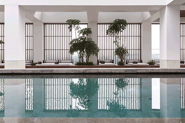 Alila Bangsar > South of the Golden Triangle is the Brickfields district. Known as the city’s Little India, it’s here travelers can find the Alila Bangsar residing within six levels of a 41-story highrise that is connected to Bangsar LRT station. Featuring a rooftop lobby that leads to a stepped down swimming pool open to the sky, the 143 guestrooms also enjoy broad panoramas of the city. “From the very beginning, the idea of creating an urban oasis in a hectic city inside a tower was important for us,” states Lyndon Neri, founding partner at Shanghai firm Neri & Hu. “By creating a landscape pool in the middle of the top floor, we consciously made a point to express this concept, which can be experienced through our spatial manipulation.” The open-air space with public amenities surrounding the pool “allows guests and visitors to have a direct relationship with nature,” because “sky and water are two essential elements in bringing a sense of solitude.”
