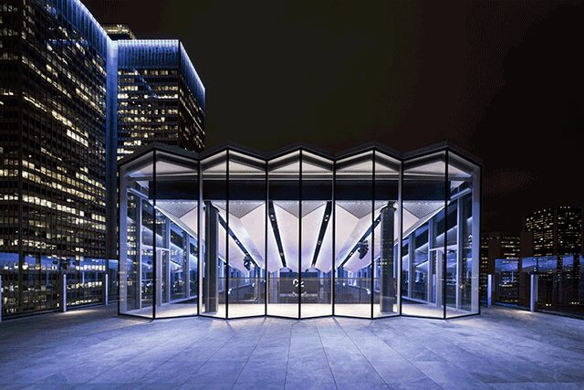 Espace C2 > Situated atop the city’s Fairmont Queen Elizabeth Hotel is a new kind of conference space, the creativity-driven Espace C2. The standalone glass structure offers unparalleled views of Montreal’s skyline and is topped by a butterfly roof, a reference to the 1960s when the building itself was constructed. “We tried to imbed the project with the very essence of what was there,” explains Jean Pelland, partner at Montreal firm Sid Lee Architecture. A lot of the elements are flexible in nature, including retractable bleachers in the main room and modular features throughout. “The biggest challenge was the structural aspect,” he explains. “To make it stand out, we had to work through all the details.”