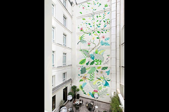 Le Belleval > Named after the botanist to King Henry IV, Le Belleval pays homage to its namesake with framed botanical images and floral patterns that adorn walls, area rugs, and throw pillows throughout. Sophisticated and rustic textures add to this green theme, also illustrated by the giant blooming fresco by muralist Gola Hundun in the plant-filled inner courtyard. Architect Jean-Philippe Nuel preserved the historical components of the building (the oculus, stone walls, and pilaster) and repurposed the original carriage entrance into a monumental lobby. The high-ceilinged, concrete-floored space includes various public areas that open to the street, including a restaurant and bar decorated with myriad patterns that excite the senses. “The ground floor areas are charged with a real energy,” Nuel says. The floral theme once again pops up in the 52 guestrooms and four suites, where plant-patterned framed images and area rugs give way to tree trunk-inspired side tables.