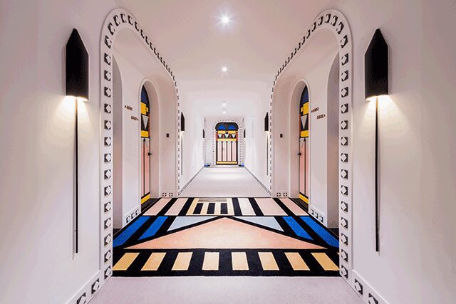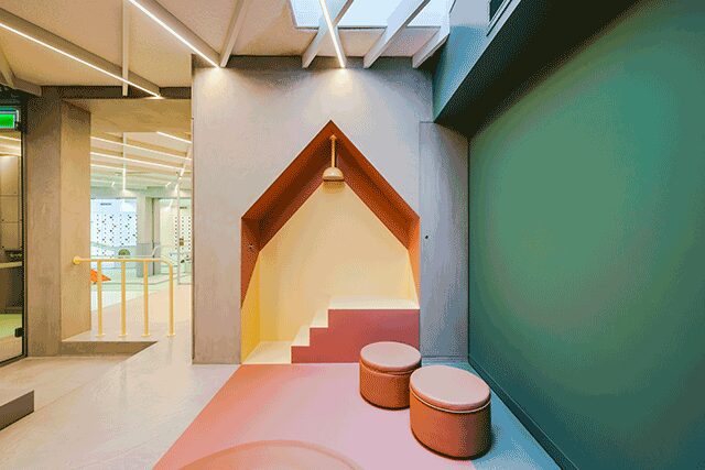 Located within Deqing Kaiyuan Senbo Resort Park in Hyzhou, China, the fantastical Magic Hotel from Shanghai firm X+Living evokes childlike wonder from the public spaces to the guestrooms and everything in between. Whether its smallest guests are sliding down the two slides or playing in the fifth-floor treehouse, geometric shapes and a kaleidoscope of color combinations reign. The style, informed by the Memphis Movement, takes a toned-down approach in guestrooms, where muted pink hues are a welcome respite from the boisterous tones in the public spaces. “This hotel not only provides a cozy and playful children’s paradise,” says X+Living president and chief designer Li Xiang, “but it’s also a calm and comfortable hotel.”