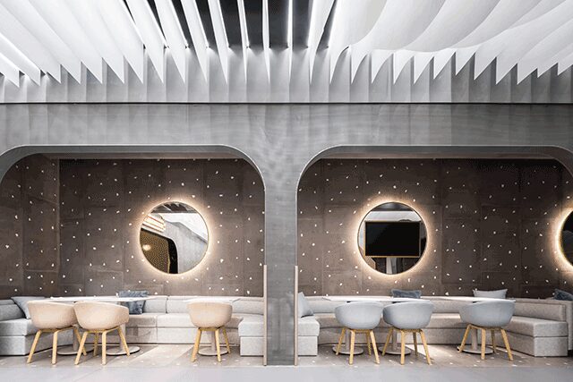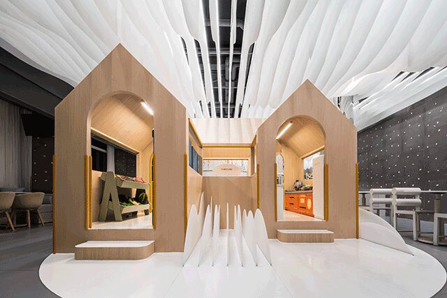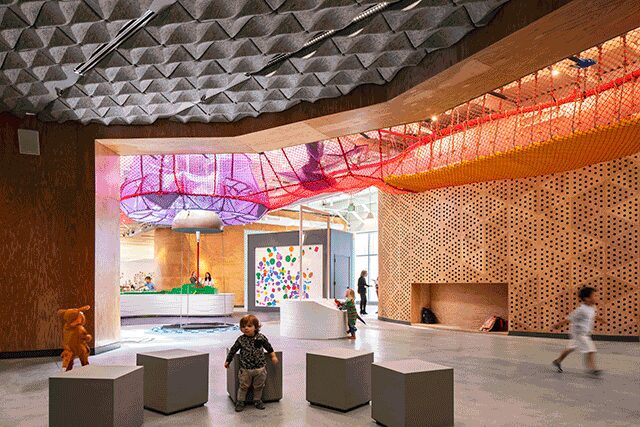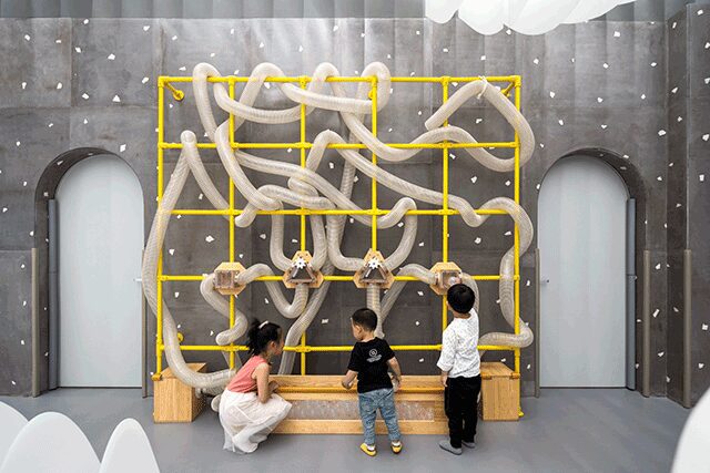 Wutopia Lab founder Yu Ting was inspired by a picture his daughter painted of two figures floating in the clouds when crafting Lolly-Laputan Café in Dalian, China. “We regard the center as a part playground, using the clouds to define the boundary,” Ting says. A perforated aluminum plate façade invites patrons inside, where the lobby features seating in a circular room with an installation of 1,000 acrylic tubes that, when light shines through, reflect sunlight navigating a canopy of trees in a forest. The whimsical café is home to Cloudy Town, where undulating acrylic panels line the floor and the ceiling, leading children to discover a carousel, slides, a ball pit, and treehouses. The play area, however, serves a dual purpose, with an educational installation on the wall meant to inspire curiosity. “We like that kids can learn [about] the world from the installation,” he says. “If kids are happy, then parents will feel happy.”