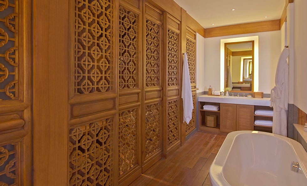 The 35 suites highlight the region. Fabrics are sourced locally, including pine from Shangri-La while stone floors reference the mountains. Furniture is influenced by the South China style.