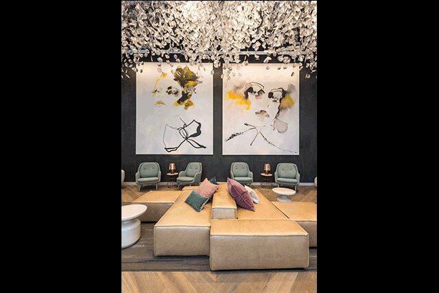 DAC Art Consulting collaborated with Studio K Creative on this high-end housing development in Chicago. The local firm’s design scheme exhibits a sense of quiet luxury, so the artwork needed to be bold. “The space is fresh and current,” says DAC’s art consultant Marilyn Breslin. “The oversized canvas pieces in the lobby [are eye-catching].” Artist Marta Spendowska’s works are typically on the smaller side, but “seeing my abstract portraiture in such grandiose scale is an absolute delight,” she says. At this size, she adds, the watercolor is allowed to shine, “showing the intuitive nature of the medium.”