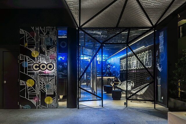 Whereas Together channels Woodstock-era connections of yesteryear, new hostel concept COO has emerged in Singapore, with its first outpost located in food and shopping hotspot Tiong Bahru. To help guests meet each other, the brand launched COO Connect—a tool available at booking that matches travelers based on their interests so they can explore the city together when they arrive. “We thought this would be a great way to embody the convivial spirit of an old-fashioned backpackers’ community while harnessing the Millennial generation’s love for digital connectivity, so it’s engaging people physically and digitally,” says Colin Seah, founder and design director of Ministry of Design (MOD). The local firm handled the design along with the so-called sociatel’s brand strategy, which sets out to engage guests with local, social, and playful experiences, marrying the physical and digital worlds in one holistic experience. Drawing on the neighborhood’s history, COO’s metal mesh entry screens recall window grills commonly used on apartments in the 1940s and ’50s, while dramatic graphics on the black walls (also done by MOD) represent local shops, architecture, and traditional food. The former shop house’s upper floors contain 11 bunk rooms for up to 68 guests, while hangout spots include a bistro and an open-air terrace on the second floor.