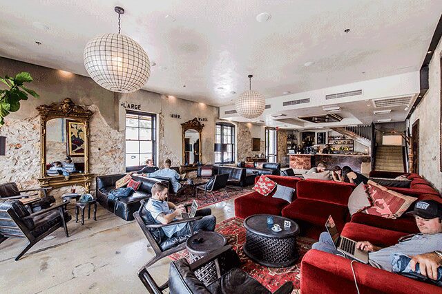 Native is bait for Millennial explorers, as the hostel’s website calls them, and has become a place for thrillseekers to reconnect in 12 communal suites outfitted with 65 beds. A collective kitchen is nothing new, but a coworking space speaks to the times and clientele. Other perks include a bar and restaurant, and an indoor stage with nightly events, all tucked within the rough limestone walls of a once-railroader hotel from 1890 and an adjacent midcentury warehouse. Local owners Michael Dickson, Antonio Madrid, and Will Steakley tasked local designers Joel Mozersky and un.box design studio’s Jared Haas with dreaming up an American tramp-art concept evident in the intricate woodwork that covers the front of the bar and some of the ceiling and door-trim treatments. “Tramp art was done by travelers, vagabonds, and nomadic workers who came into Austin by rail to work in the 1800s,” explains Dickson. “They took discarded objects—like crates and cigar boxes—and carved them into really beautiful pieces.” In guestrooms, red privacy curtains hang along handcrafted bunks hewn from Douglas fir, and ornate ruby-hued rugs contrast white oak floors. Though Native recently opened, “our intent is to expand this concept as quickly as we can,” says Dickson, who plans to keep future projects hyper-local, appealing to both travelers and local residents alike.