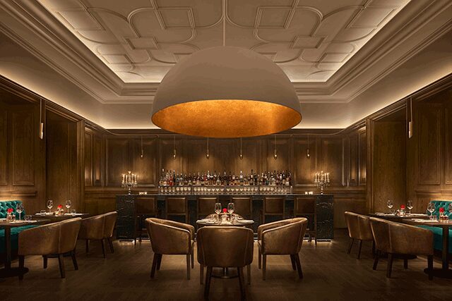 A massive light fixture hangs in the Oak Room restaurant at the Abu Dhabi EDITION, a collaboration with Wimberly Interiors.