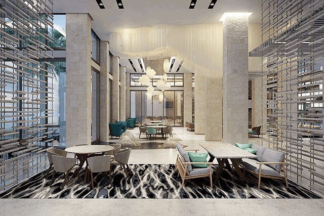 For the brand’s first Mexico hotel, Mexico City-based Estudio Lemus Arquitectos and Idea Asociados conceived the design of the Renaissance Cancun around Mayan mythology, notably at arrival, where guests are greeted by a wooden sculpture that represents a sacred Mayan tree. Contrasts in materials and textures define the 180-room property, allowing for “spaces to be fun, but also functional and timeless,” says Idea Asociados general director Agustin Caso.