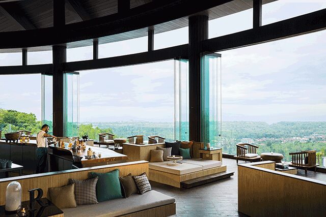 Floor-to-ceiling windows at R Bar in the Renaissance Bali Uluwatu Resort & Spa offer views of the Bukit peninsula