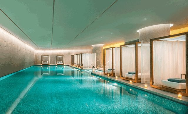 The centerpiece of the shimmering and dream-like BVLGARI spa is the 82-foot-long indoor pool, which is surrounded by Vicenza stone and cabanas for lounging with columns that mimic “the feel of an ancient Roman bath,” notes Citterio. The adjacent vitality pool is dressed in green marble that mingles with gold and green mosaic tiles, while an ice fountain in the front is a welcoming vision of diamonds spilling from the sky with “its constant flow of sparkling ice tumbling down from the ceiling,” he says.