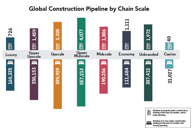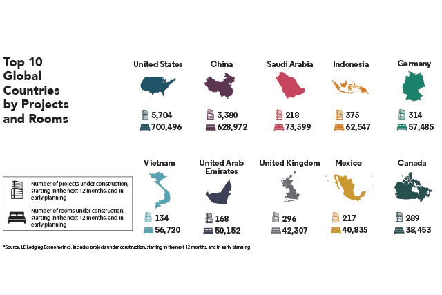 While growth is happening globally from Saudi Arabia to Mexico, the U.S. is the clear leader in terms of projects and rooms. California, for instance, has 699 projects in construction, with almost 97,000 guestrooms. “There is no country anywhere else in the world other than the U.S. and China that has as many rooms in the pipeline as the state of California,” Ford says.